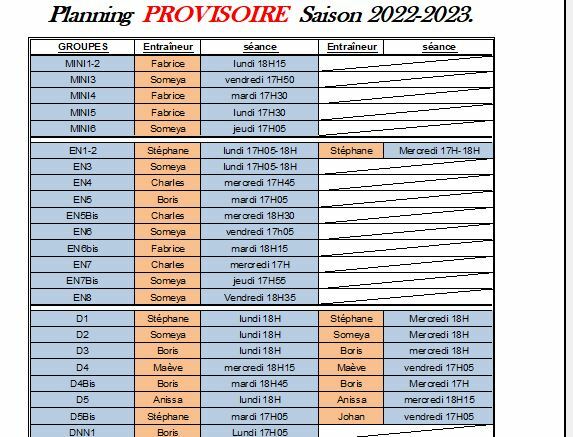 La grande majorité de nos entraîneurs a son emploi du temps pour l'année à venir. Nous avons plusieurs entraîneurs qui sont encore à l'université en Sciences et Techniques des Activités Physiques et Sportives (STAPS) et nous ne pouvions publier le planning tant qu'ils n'avaient pas leur emploi du temps à la fac. Ce vendredi, nous avons enfin pu, avec les données actuelles, créer un planning pour cette saison. Ce planning peut encore connaître quelques modifications en fonction des résultats aux test que nous ferons la semaine prochaine. En général, nous testons entre 200 et 300 enfants et en fonction des résultats, nous pouvons modifier 2 ou 3 groupes pour nous adapter aux résultats des tests et ainsi pouvoir contenter le maximum d'adhérents. Nous essaierons bien sûr de modifier le moins possible ce planning pour ne pas perturber les organisations familiales.