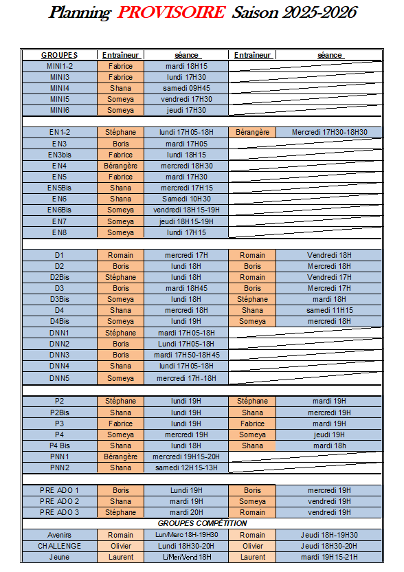 Merci pour votre patience, nous venons d'avoir tous les emplois du temps de nos entraîneurs et nous avons pu finaliser notre planning pour cette saison.